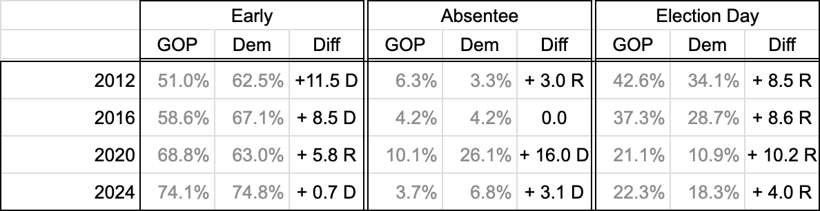 Here’s what I read from this one — in the past, there was a clear difference in voting methods, with Early Voting being more popular among Democratic voters, and Election Day Voting being more popular among Republican voters, but those numbers weren’t terribly big, and they have shrunk considerably. To the point where Early Voting was within 1%, and Election Day voting was down to a 4% difference.